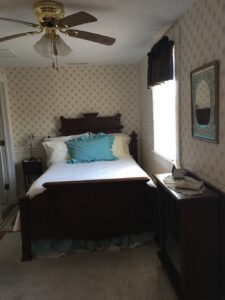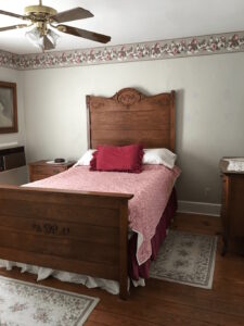 Upstairs in back of house, Antique Queen Bed, with scrolled head and foot board, private bathroom with shower, air with ceiling fan, dorm refrigerator, large closet.