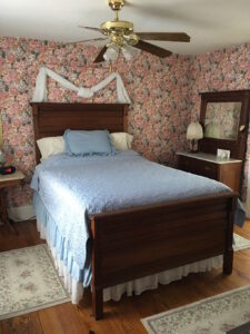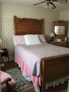 On the 1st floor, facing Main Street and has antique oak, queen size bedroom set, private reading room/ enclosed porch area and a private bathroom with shower.
